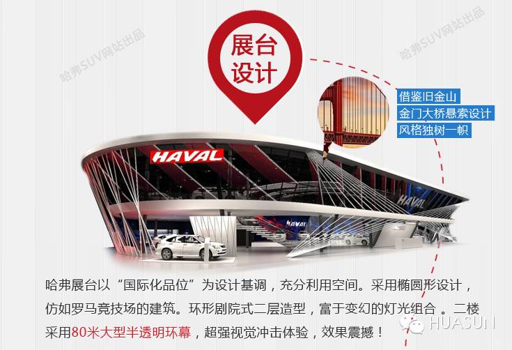 哈弗展台在今年北京车展亮点十足,整体设计以视点融合意识空间。歌剧院式造型,分上下两层,在满足顾客参观便利的同时展现哈弗品位。展台正面采用斜拉索的设计,借鉴了美国旧金山金门大桥吊索的设计理念,充分的展现了汽车的工业感和设计美感;舞台二层的环幕采用HUASUN大尺寸Pixel Strip-25具有强烈的视觉冲击力,为消费者带来震撼的艺术享受。这是HUASUN继通用汽车,观致汽车等品牌汽车制造商合作的又一力作,也是HUASUN持续创新和个性化定制的最好诠释。